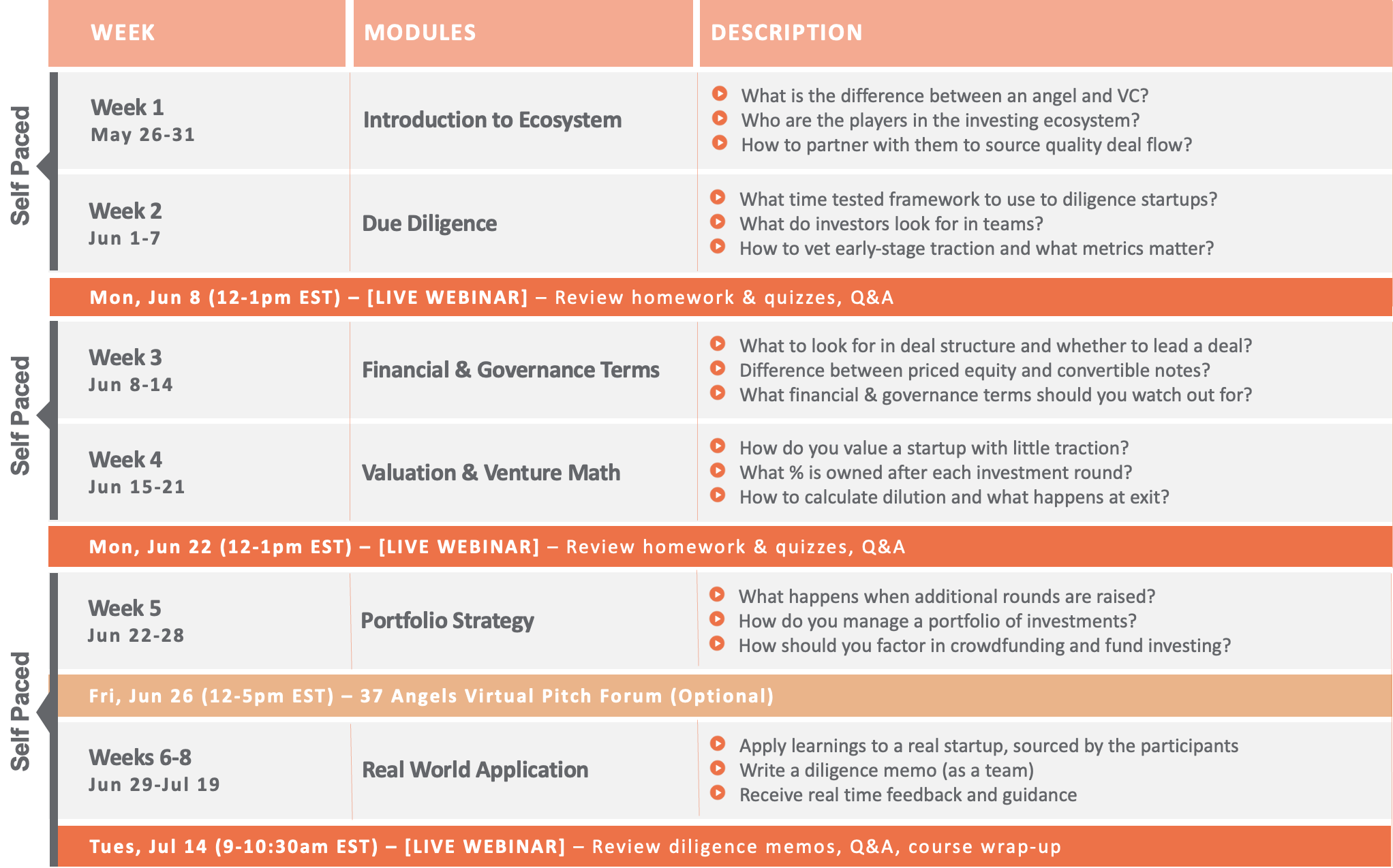 Receive one on one guidance, get to know your cohort through group work, and get access to 37 Angels events for one year