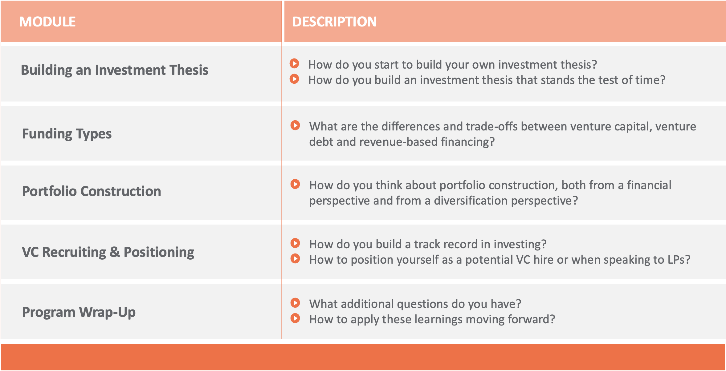 Designed for both new and seasoned investors, our program will assist you in understanding the process of developing an investment thesis, how to think about portfolio construction, and the tradeoffs between different funding types.